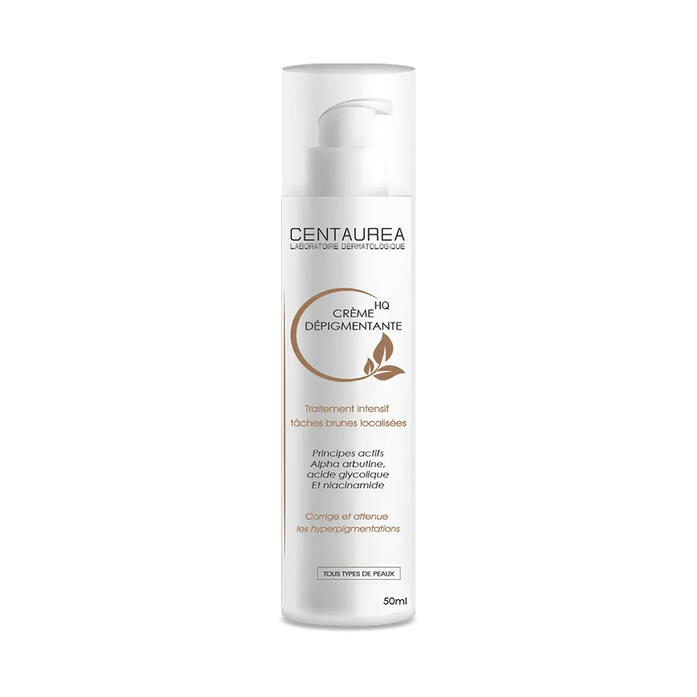 La crème dépigmentante CENTAUREA est un soin dépigmentant avec Hydroquinone 2%, est une émulsion dépigmentante qui diminue l’intensité des taches brunes, favorise leur élimination et prévient leur apparition.sa formule légère, facilement absorbable par la peau sans irritation et sans ressentir l’inconfort des couches excessives et par conséquent, est le choix idéal pour toutes les peaux sensibles, mixtes et les peaux grasses.