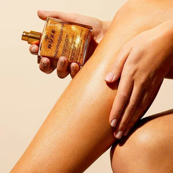 - Sur le visage, appliqué par petites touches sur un pinceau plat ou de la pulpe des doigts, en insistant sur les pointes de lumière du visage : os de la pommette, arrête du nez, front au-dessus des sourcils. Vous pouvez aussi mélanger quelques gouttes au creux de votre main avec votre crème Nuxe ou votre fond de teint, avant application, pour un subtil effet glow.