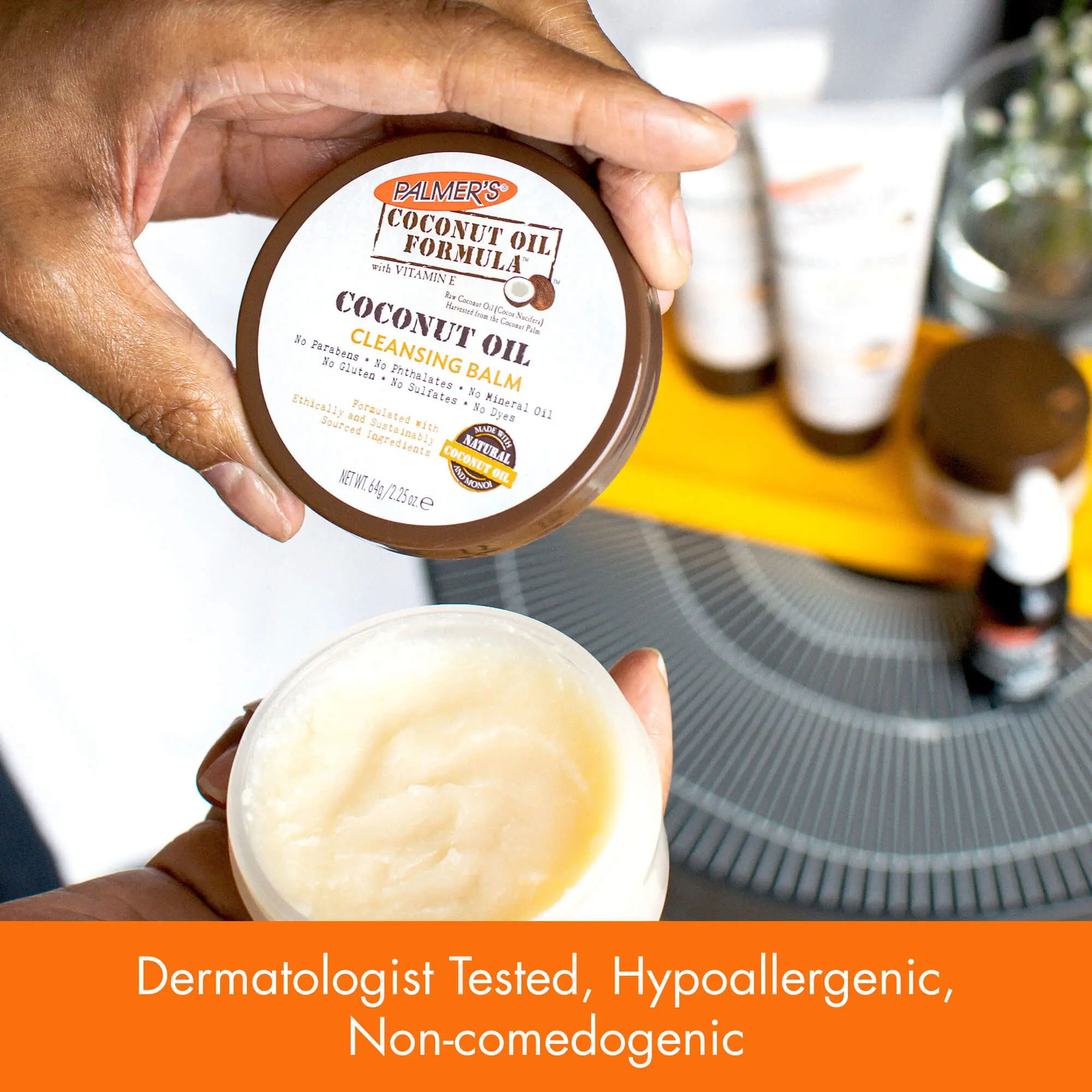 le baume nettoyant pour le visage au monoï de noix de coco de Palmer est un nettoyant solide pour le visage à base d’huile naturelle qui le rend efficace et sans effort pour enlever le maquillage, même le maquillage des yeux longue tenue et tenace.